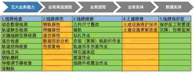 在轨道运维业务中,,,,,,,,,,我们形成了完整的从业务能力(业务域)-业务流程-业务实体-数据模型的分析梳理过程。。。。。。。。。轨道运维业务能力如下图所示::::::::