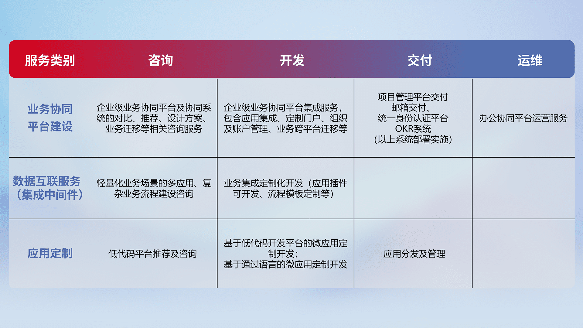 针对钉钉、、、企微、、IDaas等平台级产品提供产品的规划、、、、方案、、交付、、定制化开发等服务,,,,实现如统一协同办公、、、、智能客户服务、、、混合会议管理、、智能数据查询、、、等业务场景,,,实现数字化转型。。。