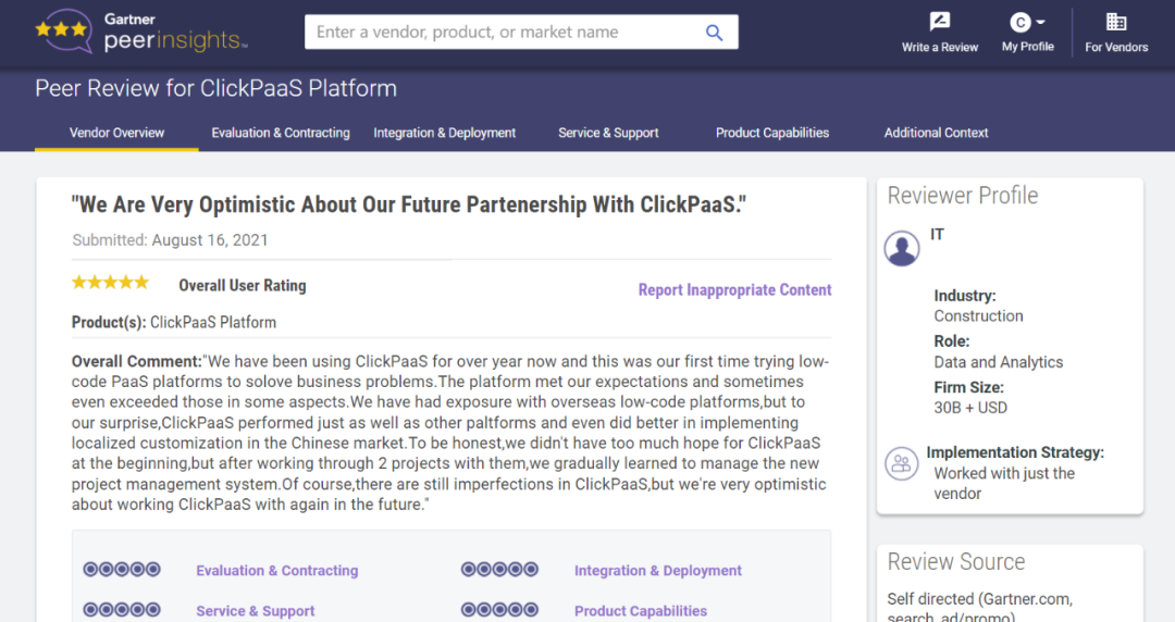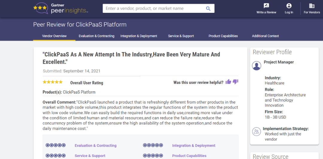 Tips::::::::【Peer Insights】——用户对企业IT产品和服务发布真实评价的平台。。。。。。。目前已有355个市场,,,,,255,000条经过验证的评价。。。。。。。。每一条评价Gartner会针对参评企业营收规模及参评人员信息做验证、、、、、评价内容做多维核实。。。。。。。。